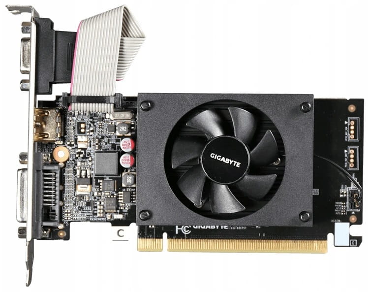 Interfejs DVI z podwójnym łączem do obsługi płaskich wyświetlaczy o największej i najwyższej rozdzielczości w branży do 4096 x 2160 ! GIGABYTE Geforce GT710 zachwyci Cię wysokiej jakości aktywnym chłodzeniem. Najnowocześniejsza technologia zapobiega przegrzewaniu się nawet po wielu godzinach i gwarantuje odpowiednie rozproszenie powietrza i zachowanie odpowiedniej temperatury. Karty z serii GeForce GT to idealny wybór dla najbardziej wymagających! Osiągaj mistrzowskie wynikiWybór odpowiednich komponentów do naszego komputera to niezwykle istotna kwestia, szczególnie dla ludzi wykorzystujących sprzęt do obciążających zadań Nawet najmniejsze detale mogą znacząco wpłynąć na wydajność Twojego urządzenia, wygodę oraz bezpieczeństwo podczas pracy. Karta graficzna GIGABYTE Geforce GT710 to fenomenalna propozycja dla wszystkich zapalonych graczy i innych osób wymagających od podzespołów najwyższej jakości. Produkt został przygotowany z najwyższej jakości materiałów, dzięki czemu pozostaje solidny i nie zawodzi nawet najwyższych oczekiwań! Wydajna przy najlepszych grachGIGABYTE Geforce GT710 to karta, która pozwoli Ci działać szybko, efektywnie i bezproblemowo. Urządzenie przygotowano w oparciu o nowoczesną architekturę, dzięki czemu pozostaje wyjątkowo wydajna nawet przy obciążających grach. Kartę wyposażono w liczne porty video. Możesz więc działać tak, jak lubisz! Kartę opracowano specjalnie z myślą o graniu w najbardziej wymagające produkcje i zabawie w wirtualnej rzeczywistości. Dobra karta do grania za niską cenę!Odkryj bezprecedensową wydajność, energooszczędność oraz wrażenia jakie dostarczą gry nowej generacji. Specyfikacja techniczna: