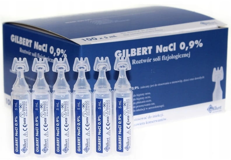 Zestaw pięciu ampułek soli fizjologicznej Gilbert dla dzieci i dorosłych Sól fizjologiczna (bardzo często nazywana również płynem fizjologicznym) to roztwór soli i wody. Jest wszechstronnym produktem, który jest praktycznie niezbędny w każdej apteczce. Jest łatwa, higieniczna i bezpieczna w obsłudze. Obojętna wobec tkanek - nie powoduje podrażnień. Stosowana przez profesjonalistówSól fizjologiczna jest bardzo często używana w szpitalach. Stosuje się ją w kroplówkach, które są podawane pacjentom po operacjach w celu uzupełnienia płynów ustrojowych. Stosuje się ją również jako rozcieńczacz do leków podawanych dożylnie. Z racji jej obojętności wobec tkanek medycy używają jej do przemywania rąk. Łatwa w obsłudze, bezpieczna, uniwersalnaW życiu codziennym sól fizjologiczna ma ogrom zastosowań! Z racji neutralnego odczynu pH (przez co nie powoduje podrażnień) jest polecana zamiast wody z kranu do przeczyszczania skóry (która bardzo często może zmieniać odczyn pH, a co za tym idzie powodować podrażnienia). Idealnie nadaje się do przemywania uszu, oczy, czy nawilżania śluzówek nosa (szczególnie w okresie wiosennym może pomóc na katary spowodowane pyłkami). Można nią również przemywać rany. Oferowana na aukcji sól jest idealna do nebulizacji i inhalacji. Zawartość opakowania