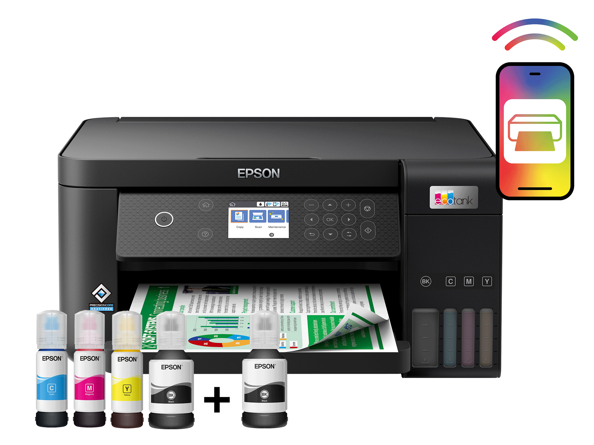 Drukarka EcoTank pozwala zaoszczędzić do 90% na kosztach druku i zawiera w zestawie atrament wystarczający nawet na 3 lata. Dołączony atrament pozwala wydrukować do 14 000 stron w czerni i 5200 stron w kolorze3. Zamienne butelki z atramentem stanowią równowartość 66 kartridży1.